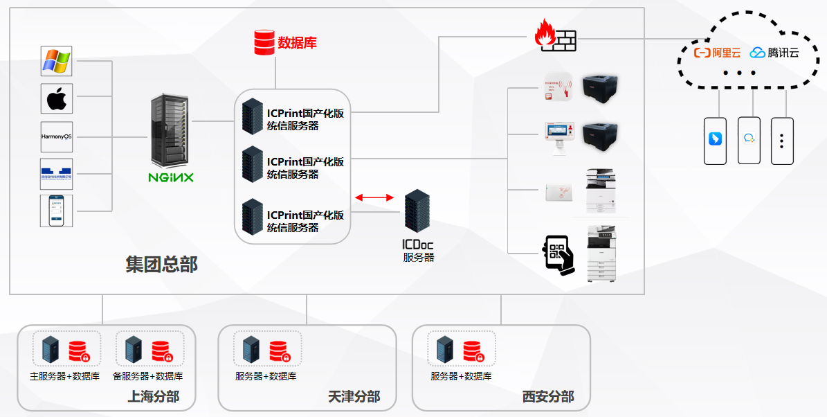 - 系统能对办公区进行统一管理,包括用户同步部分,并通过分布式部署及打印故障漂移,当局部地区出现故障,仍可进行打印机、复印或扫描;