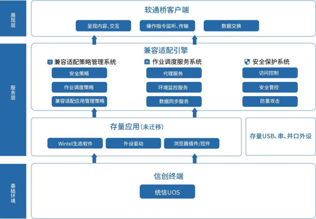 本联合解决方案旨在将软通桥兼容适配系统与统信 UOS 的稳定运行环境深度融合,解决党政、能源、医疗、教育等行业内关键业务系统的低成本迁移,快速完成从 Wintel 生态环境向信创环境的平滑过渡和无缝切换,为各行业破解过渡阶段自主创新应用生态匮乏难题提供了可行的手段,降低了自主创新改造成本、提高了自主创新改造实施效率,助力用户实现在统信操作系统上“真兼容、高性能、零感知”的迁移体验。
