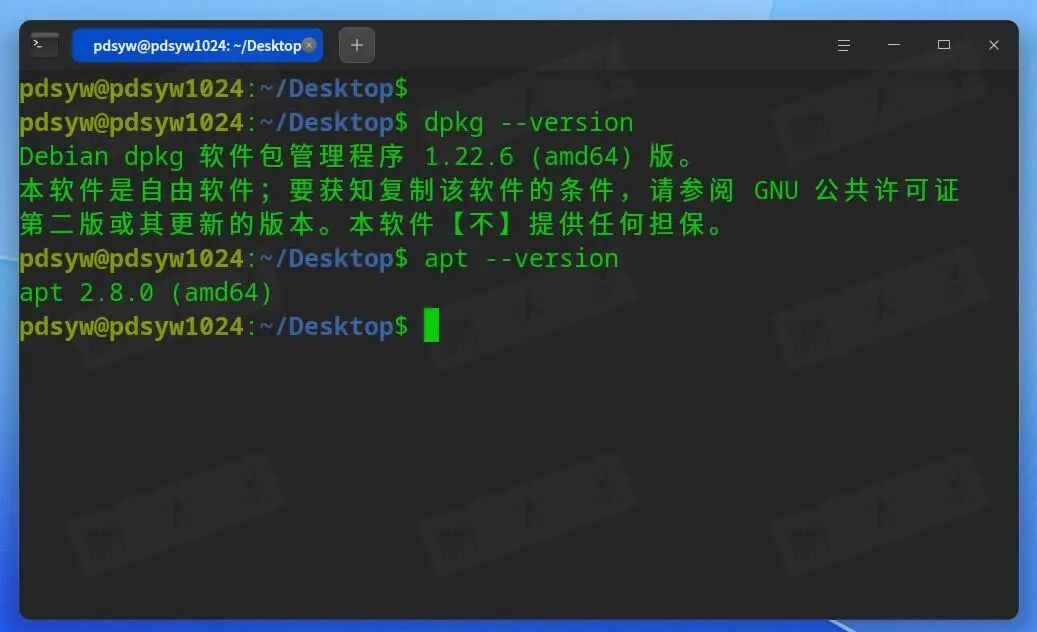 pdsyw@pdsyw1024:~/Desktop$ dpkg --versionDebian dpkg 软件包管理程序 1.22.6 (amd64) 版。本软件是自由软件;要获知复制该软件的条件,请参阅 GNU 公共许可证第二版或其更新的版本。本软件【不】提供任何担保。pdsyw@pdsyw1024:~/Desktop$ apt --versionapt 2.8.0 (amd64)
