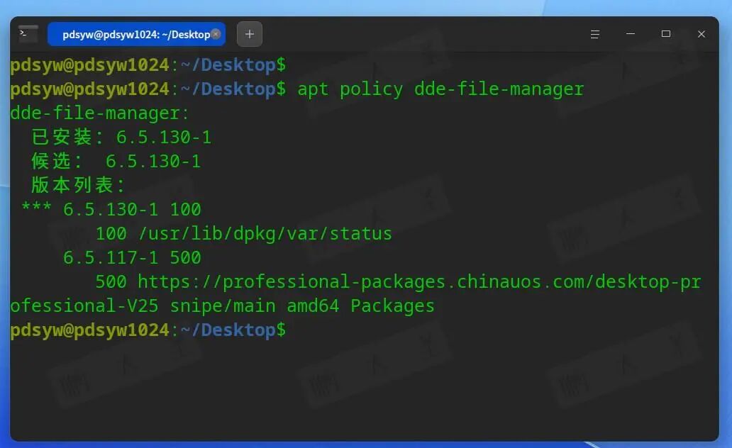 pdsyw@pdsyw1024:~/Desktop$ apt policy dde-file-managerdde-file-manager:已安装:6.5.130-1候选: 6.5.130-1版本列表:*** 6.5.130-1 100100 /usr/lib/dpkg/var/status6.5.117-1 500500 https://professional-packages.chinauos.com/desktop-professional-V25 snipe/main amd64 Packages