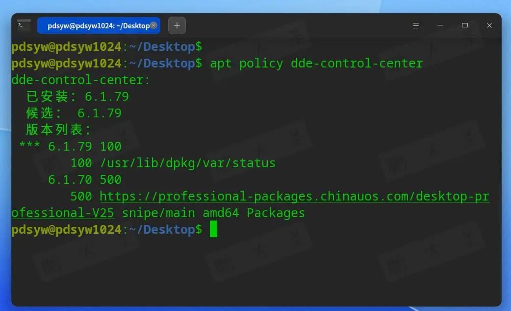pdsyw@pdsyw1024:~/Desktop$ apt policy dde-control-centerdde-control-center:已安装:6.1.79候选: 6.1.79版本列表:*** 6.1.79 100100 /usr/lib/dpkg/var/status6.1.70 500500 https://professional-packages.chinauos.com/desktop-professional-V25 snipe/main amd64 Packages