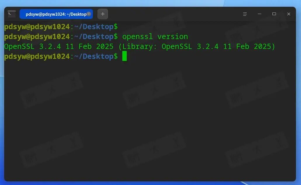 pdsyw@pdsyw1024:~/Desktop$ openssl versionOpenSSL 3.2.4 11 Feb 2025 (Library: OpenSSL 3.2.4 11 Feb 2025)