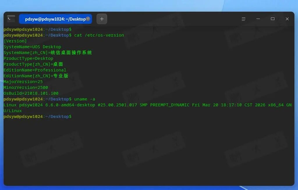 pdsyw@pdsyw1024:~/Desktop$ cat /etc/os-version[Version]SystemName=UOS DesktopSystemName[zh_CN]=统信桌面操作系统ProductType=DesktopProductType[zh_CN]=桌面EditionName=ProfessionalEditionName[zh_CN]=专业版MajorVersion=25MinorVersion=2500OsBuild=21018.101.100pdsyw@pdsyw1024:~/Desktop$ uname -aLinux pdsyw1024 6.6.0-amd64-desktop #25.00.2501.017 SMP PREEMPT_DYNAMIC Fri Mar 20 18:17:10 CST 2026 x86_64 GNU/Linux