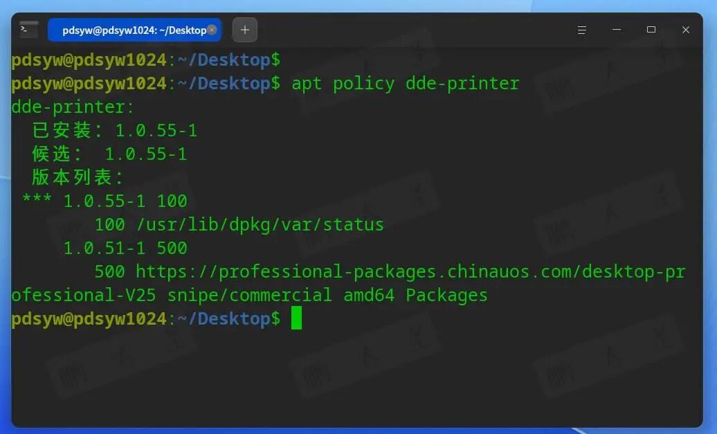 pdsyw@pdsyw1024:~/Desktop$ apt policy dde-printerdde-printer:已安装:1.0.55-1候选: 1.0.55-1版本列表:*** 1.0.55-1 100100 /usr/lib/dpkg/var/status1.0.51-1 500500 https://professional-packages.chinauos.com/desktop-professional-V25 snipe/commercial amd64 Packages