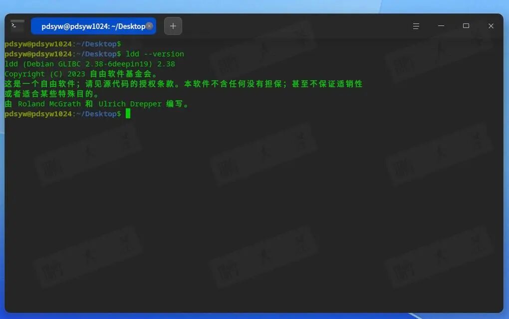 pdsyw@pdsyw1024:~/Desktop$ ldd --versionldd (Debian GLIBC 2.38-6deepin19) 2.38Copyright (C) 2023 自由软件基金会。这是一个自由软件;请见源代码的授权条款。本软件不含任何没有担保;甚至不保证适销性或者适合某些特殊目的。由 Roland McGrath 和 Ulrich Drepper 编写。
