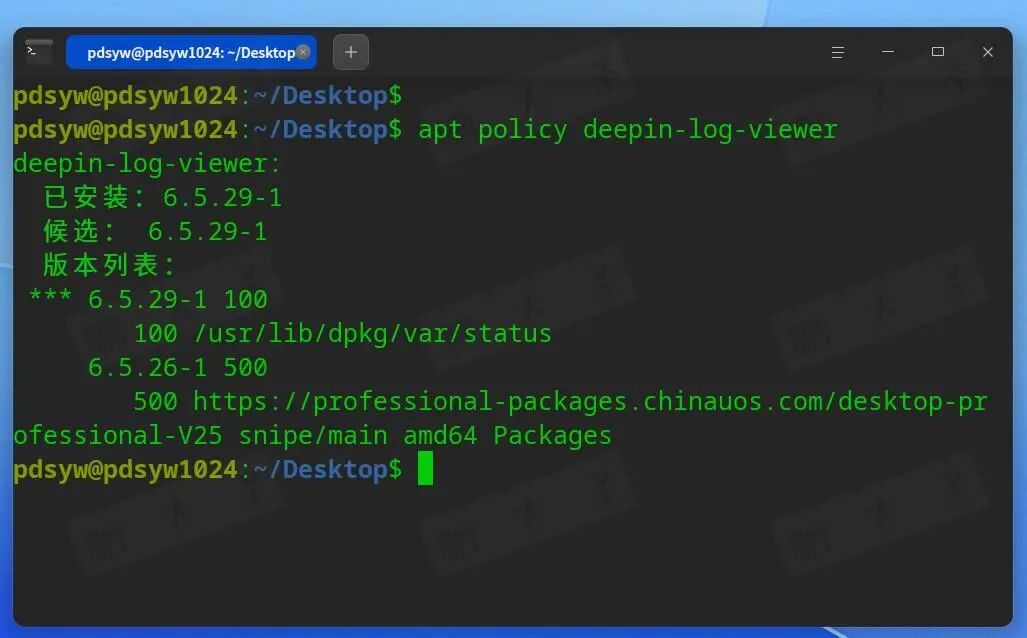 pdsyw@pdsyw1024:~/Desktop$ apt policy deepin-log-viewerdeepin-log-viewer:已安装:6.5.29-1候选: 6.5.29-1版本列表:*** 6.5.29-1 100100 /usr/lib/dpkg/var/status6.5.26-1 500500 https://professional-packages.chinauos.com/desktop-professional-V25 snipe/main amd64 Packages