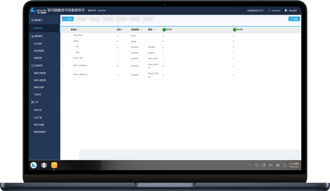 银河麒麟高可用集群软件智能迁移配置功能