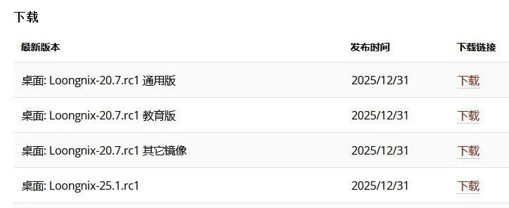 2025-12-31 赶在2025年最后一天龙芯发布 loongnix25rc1(新世界ABI 2.0)和 loongnix20.7 (旧世界ABI 1.0)安装镜像,详细发布说明访问如下网址: