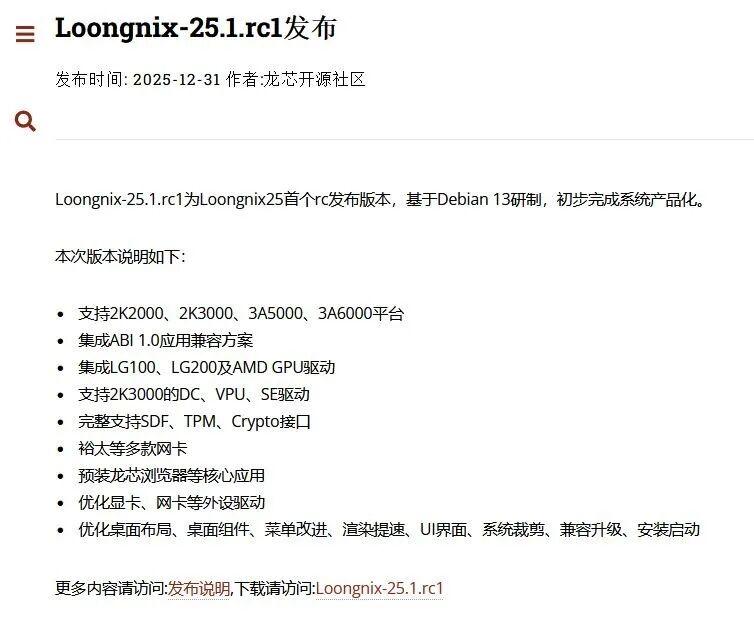Loongnix-25.1.rc1发布。Loongnix-25.1.rc1为Loongnix25首个rc发布版本,基于Debian 13研制,初步完成系统产品化。龙芯新世界系统携龙芯GPU IP新世界DKMS驱动,为“十五五”开局之年开了一个好头!