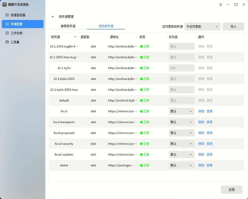 • 一键导入:内置清华、阿里云等主流推荐软件源,支持包含源码(src),一键点击即可导入至“我的软件源”。