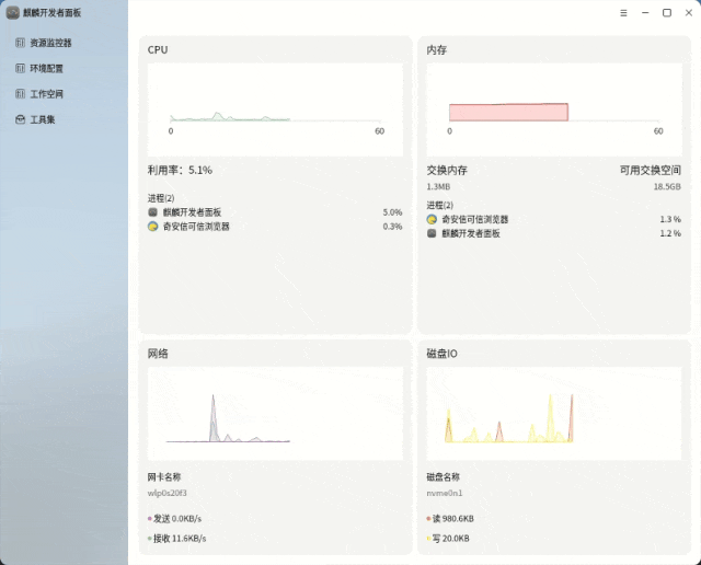 开发者面板的资源监控器界面专为开发工作流设计,在一个界面中集中、简洁地展示系统四大关键资源状态,能够帮助开发者快速定位性能瓶颈、发现系统资源漏洞、优化系统配置。